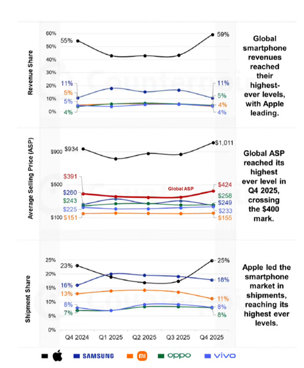 调研机构Counterpoint Research的数据显示,全球智妙手机正在2025年第四时度的平均售价初次冲破400美元,同比上涨 8%,延续了此前高端化带动ASP持续走高的趋向。